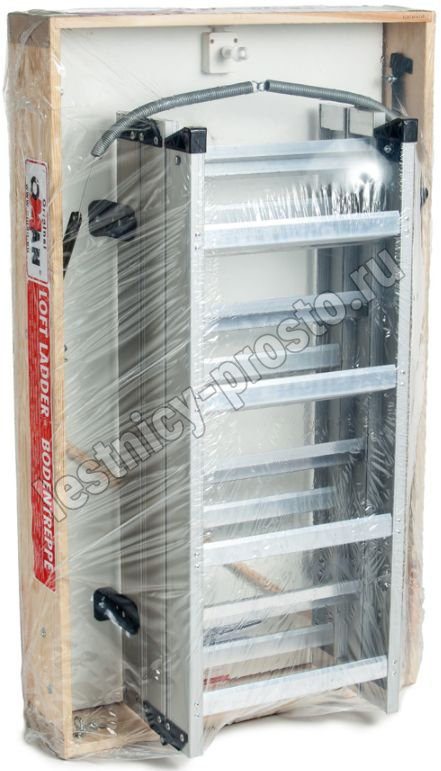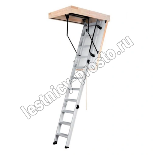 Складная 3-х секционная (до 2800 мм) или 4-х секционная (до 3500 мм) чердачная лестница. Рабочая поверхность полностью выполнена из алюминия. Термоизоляционная крышка типа "сэндвич" имеет усиленную теплозащиту, облицована с двух сторон ДВП белого цвета. По контуру короба имеется уплотнитель;