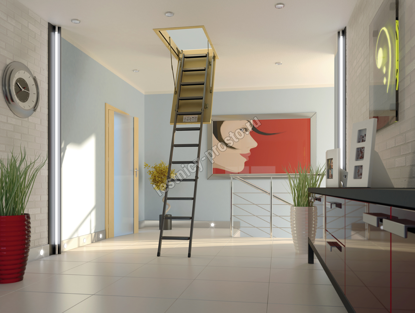 Установленные в лестнице угловые петли-шарниры нового образца придают ей высокую прочность и надежность, а также предохраняют короб от возможной деформации. Основное преимущество чердачной складной металлической лестницы LMS сводится к ее небольшим габаритам при сохранении высокой функциональности, прочности, надежности и эстетичности конструкции. Монтировать лестницу очень просто, для этого не придется затрачивать много времени и сил.