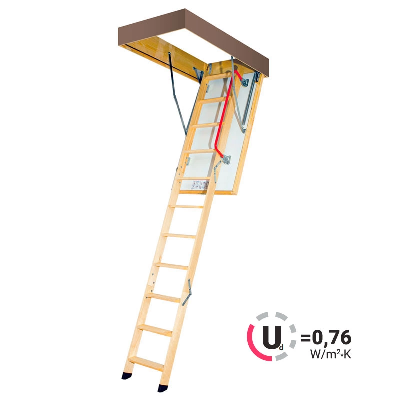 Чердачная лестница LTK Thermo изготовлена из сосны высшего качества и укомплектована утепленной крышкой люка толщиной 66 мм с повышенными теплоизоляционными свойствами. Данную модель лестницы можно использовать даже в домах, где значительна разница температур между этажами, и тем самым ограничить проникновение холода в жилые помещения. Лестница состоит из трех секций, которые компактно складываются и «хранятся в потолке». Крышка люка облицована ДВП белого цвета, что делает ее практически незаметной при установке в светлом или белом потолке. Для большего удобства и безопасности эксплуатации лестница Thermo оснащена боковым металлическим поручнем, а пластиковые наконечники предохраняют поверхность пола от повреждения и увеличивают устойчивость конструкции