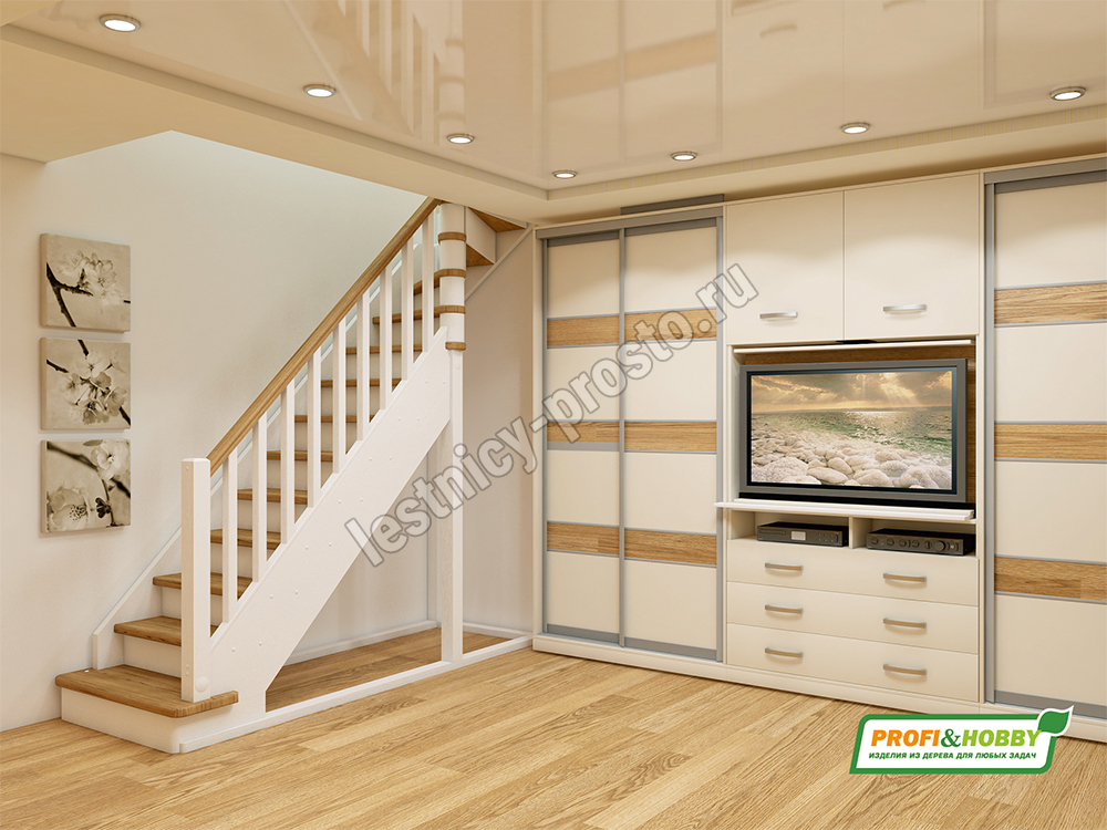 Комфортная малогабаритная лестница с подступёнками. Незаменима в помещениях, где необходимо сэкономить пространство.
