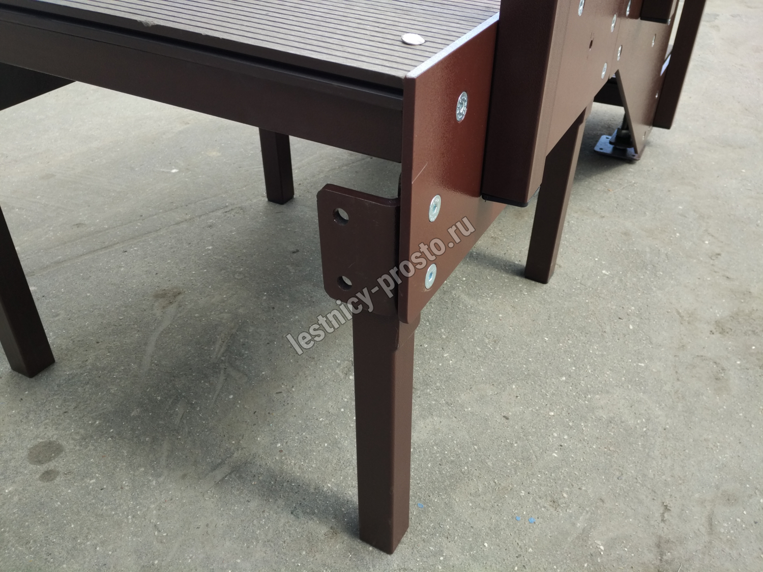 Ступени лестницы состоят из металлической рамки, обеспечивающей необходимую прочность, и покрытия из террасной доски ДПК (древесно-полимерный композит). Ступени не боятся воды и мороза, не теряют со временем свой внешний вид и не требуют ухода.