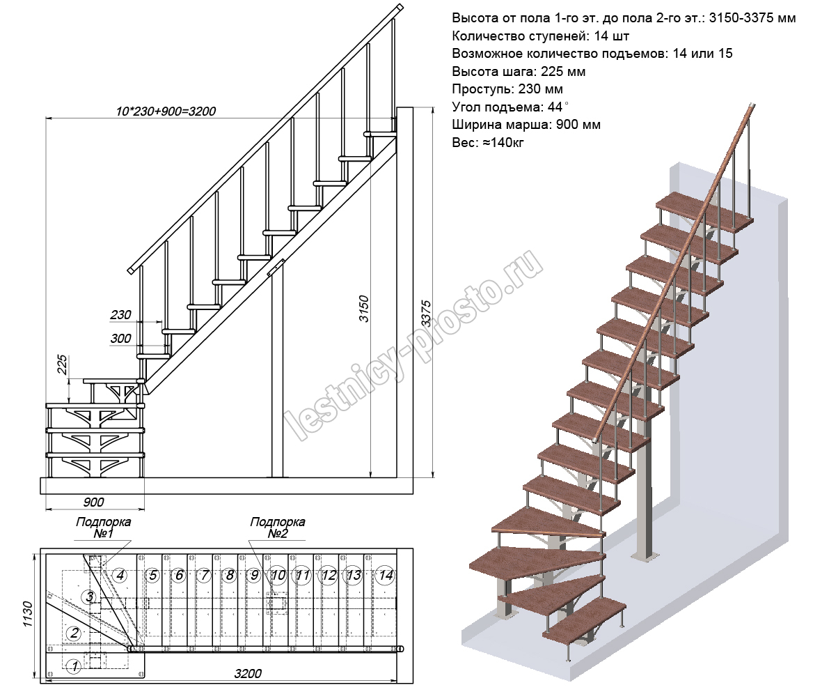 Высота лестницы 3150 - 3375 мм