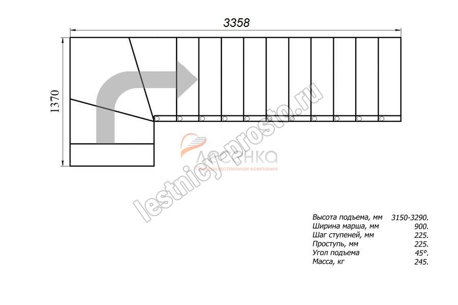 Модульная лестница Фаворит 225 3150-3290, Черный, Лиственница, Нержавеющая сталь