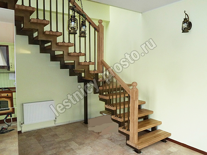 У данного варианта лестницы поворот реализован через забежные ступени. Под заказ возможно изготовление каркаса под поворотную площадку.
