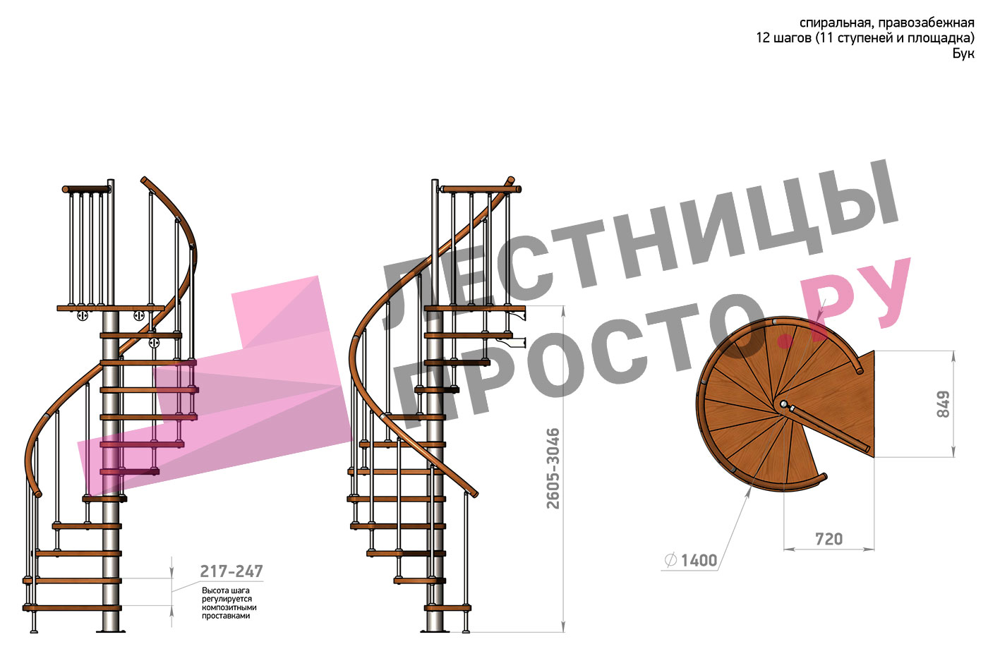 Винтовая лестница Prosto Spiral White D140см, h260.5-304.6 см, бук