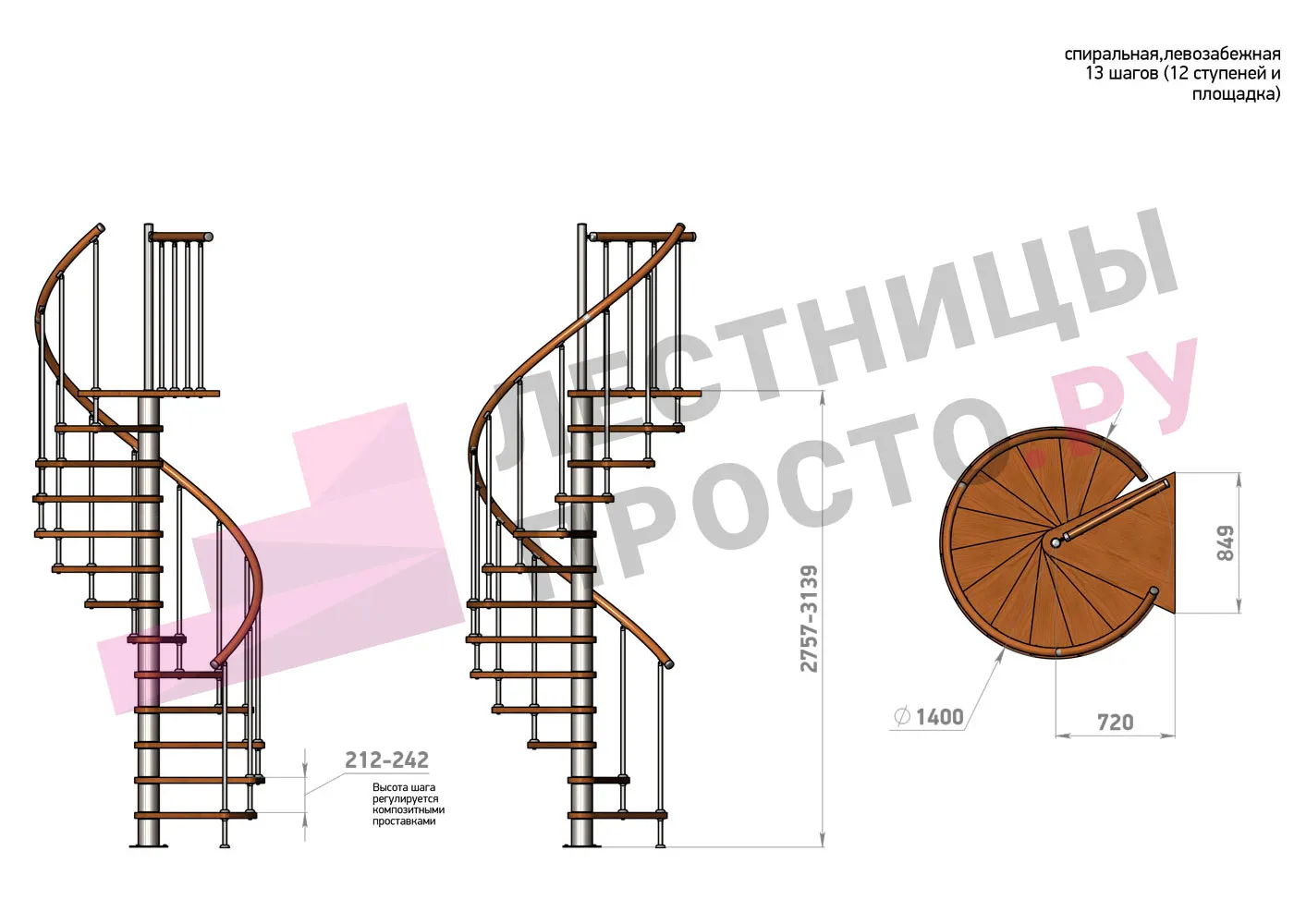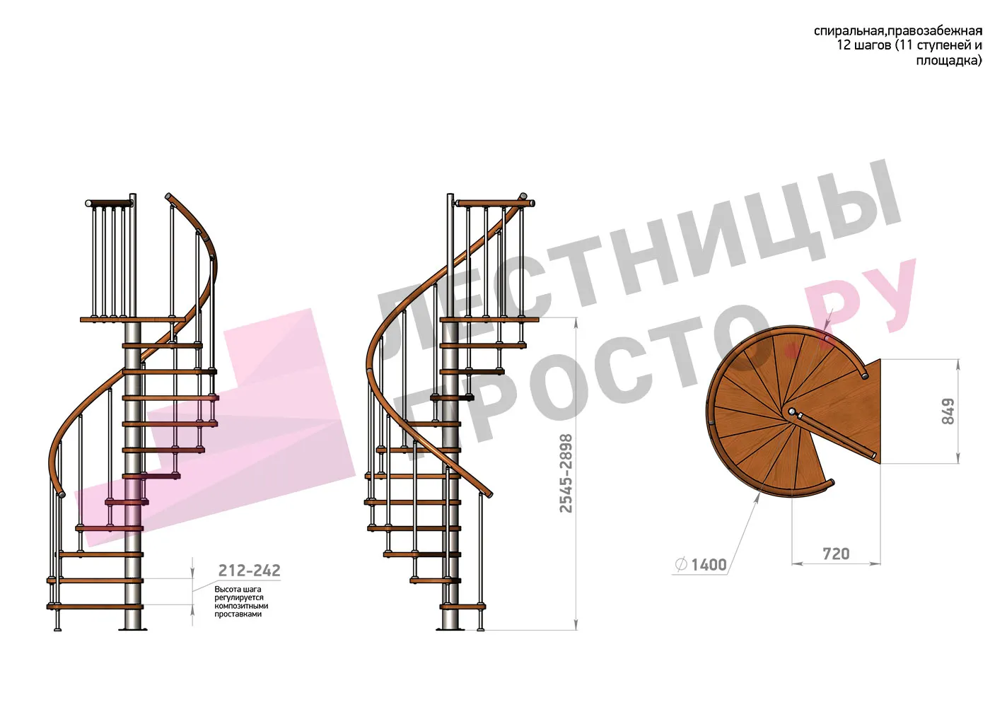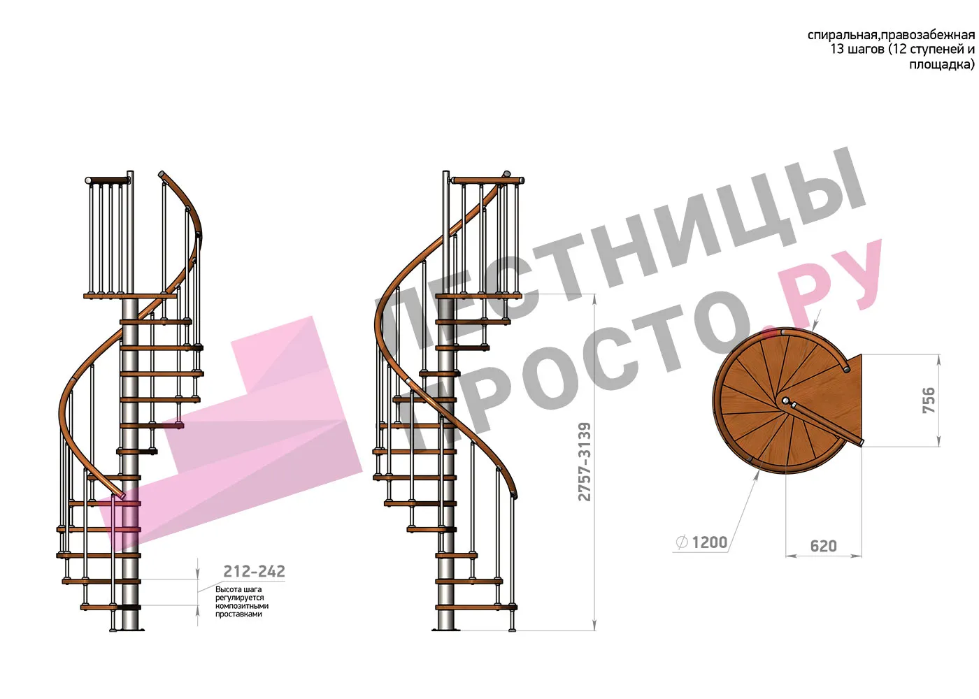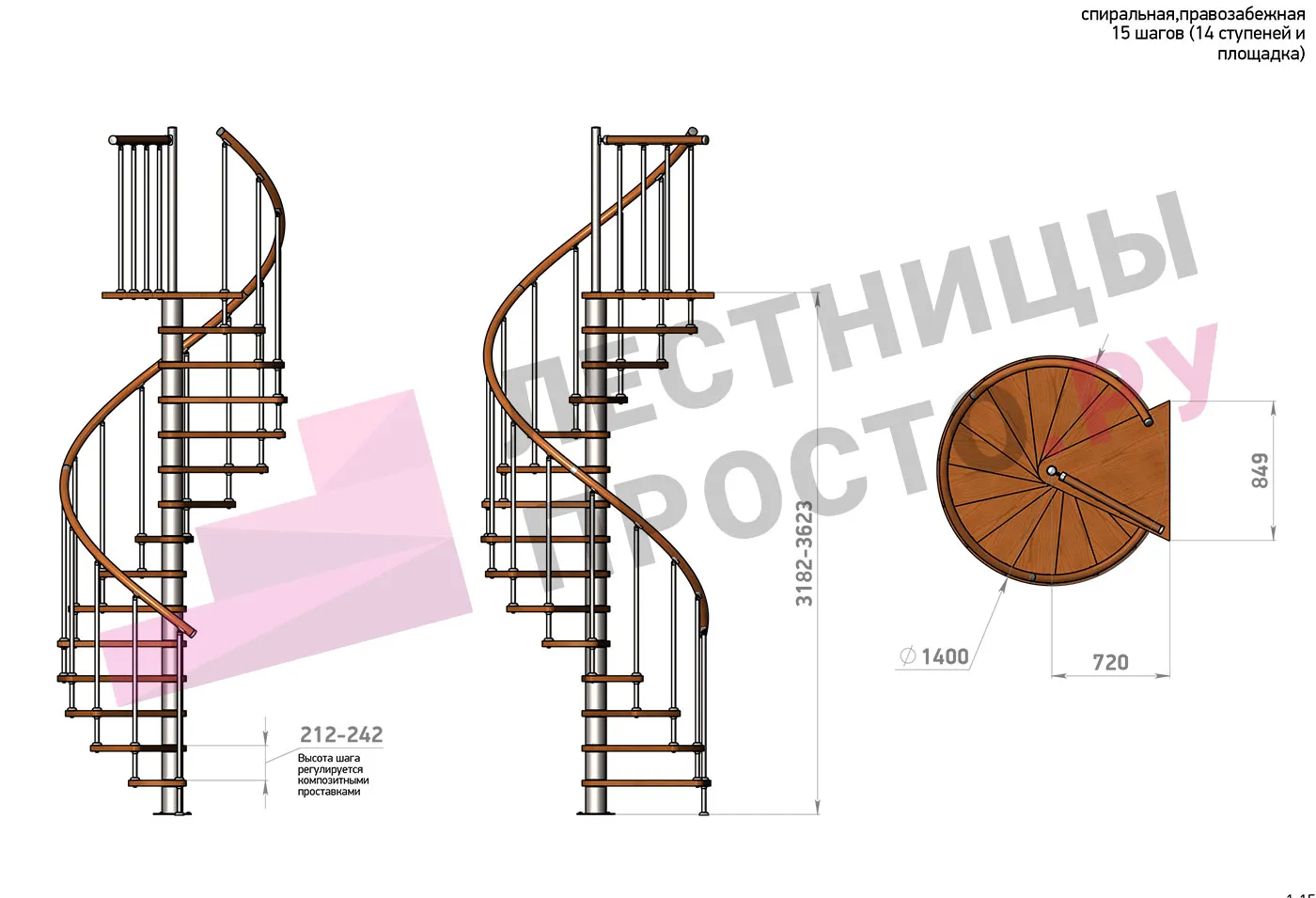 Высота ступеней регулируется с шагом 3 мм. в пределах 212-242 мм., благодаря чему, лестница прекрасно подгоняется под необходимую высоту.