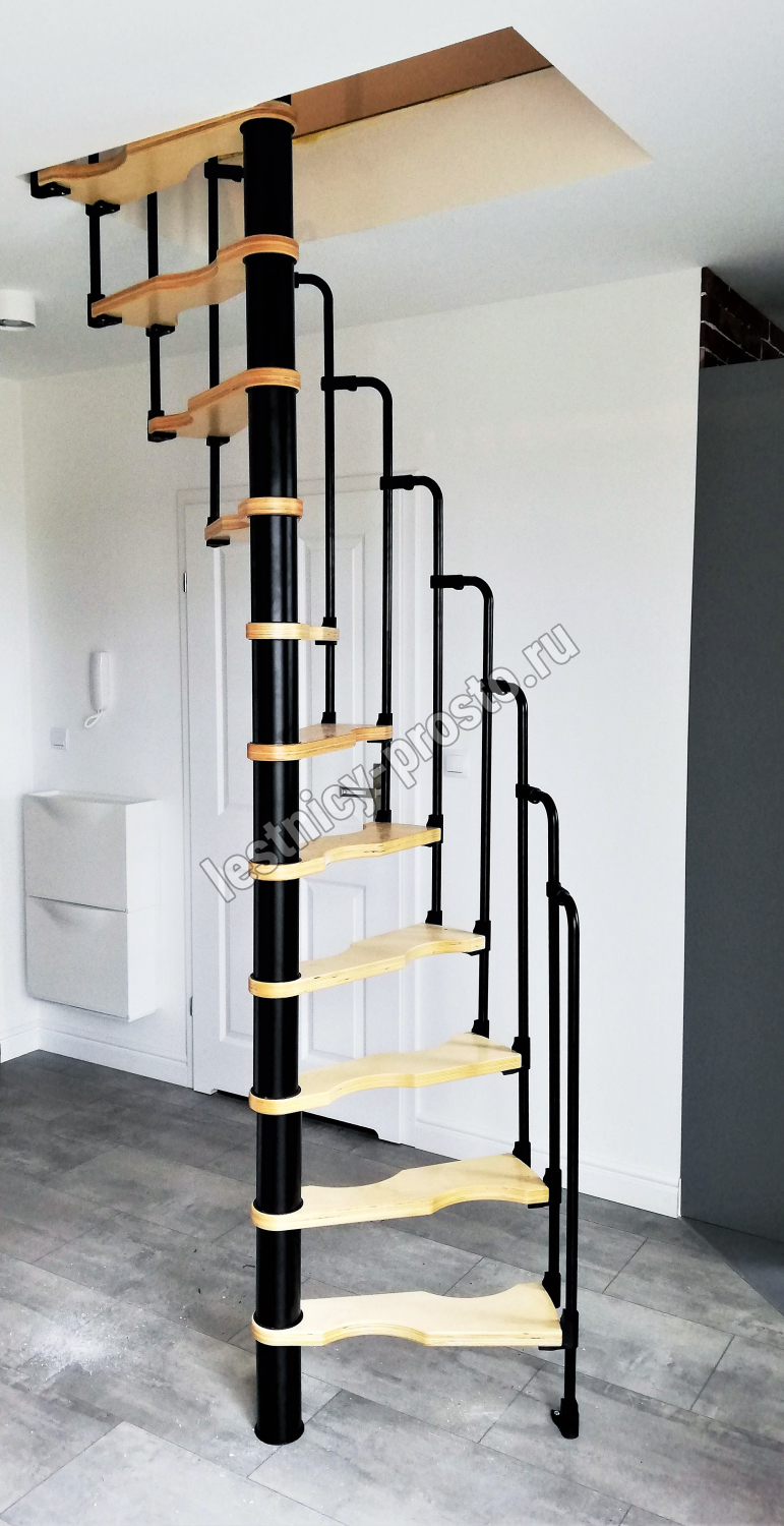 Компактная надёжная лестница. Ступени толщиной 30 мм, изготовлены из массива берёзы по технологии Multiplex, лакированные. Все металлические части оцинкованы горячим способом и покрыты порошковой краской - черного цвета; Лестница имеет надёжную несущую стальную конструкцию.
