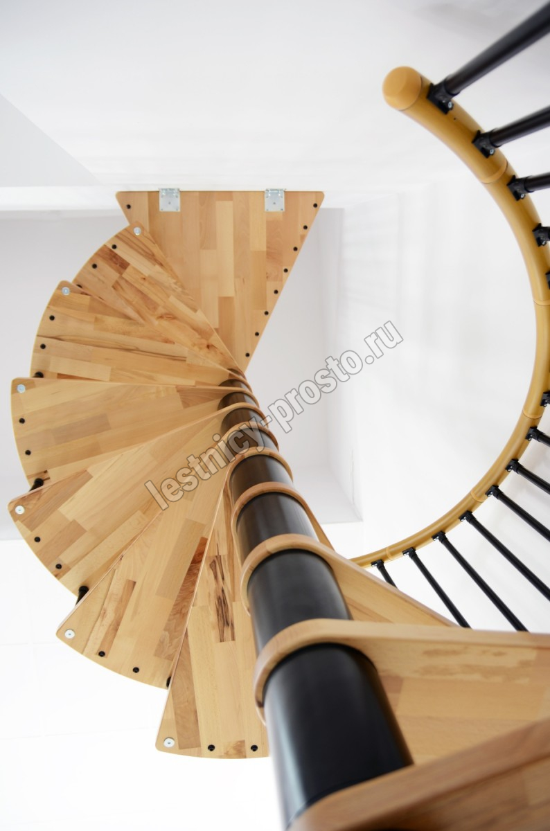 Лестница представлена в двух вариантах: с поворотом направо и с поворотом налево. Благодаря возможности регулировать высоту шага с помощью пластиковых вставок (входят в базовый комплект), высоту лестницы можно варьировать в пределах от 2860 до 3090 мм. Кроме того, купив дополнительную секцию для этой лестницы, можно поднять высоту до 3320 мм. Поручень изготовлен из массива бука в тон ступеням. Ступени и поручень покрыты износостойким защитным лаком.